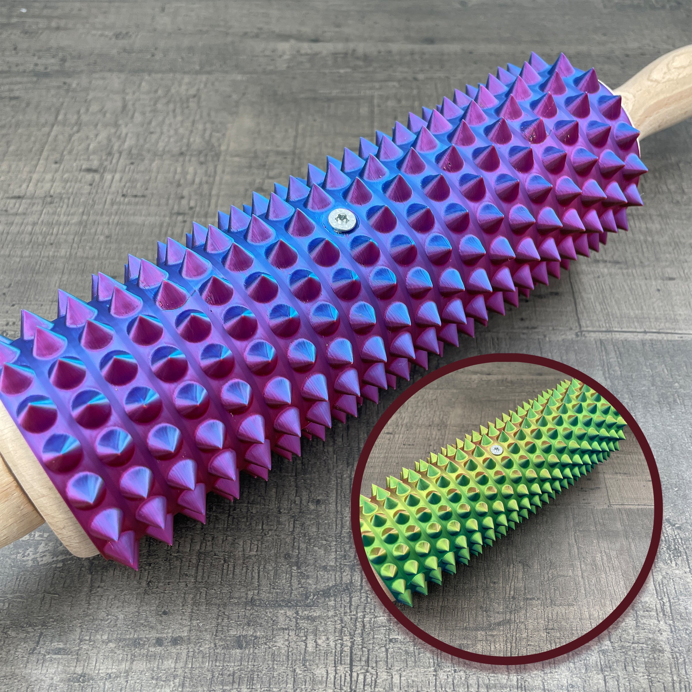 Looking for a fresh twist to your play? With this spiked roller, dominants are ready to roll, while submissives... might just get caught in the spin! From a glittery purple to a full rainbow gradient, this roller doesn’t just have bite – it’s got flair. And for anyone seeking a “softer” sensation, we even offer a pink version, because, as any kinkster knows, pink doesn’t hurt!